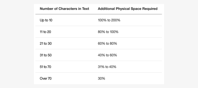 IBM’s globalization 網站中有個非常有用的表格,上方告知若要將英文翻譯成其他語言,需要的空間大概是多少。